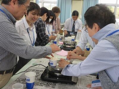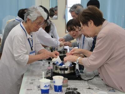 その後、各自持ってきた容器の思い出話を発表し、場の雰囲気が和やかになったところで、シニアと高校生がペアとなり、キャンドル制作にとりかかりました。