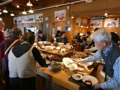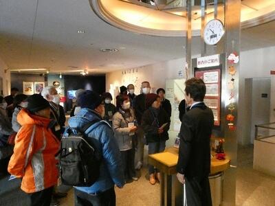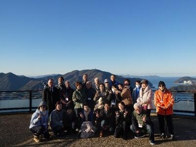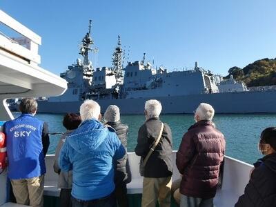 バス乗車時に旅のしおりを手渡しで配布され、車中では母校や舞鶴にまつわるクイズで移動時間も楽しませてくれ、手作り感満載です。最初に訪れた乗船型の体験施設「エル・マールまいづる」では、3つのグループに分かれて行動し、当日は天候にも恵まれ、展望デッキや展示を楽しみました。昼食の自然食バイキングも評判上々でした。貸切遊覧船では、偶然にも普段停泊していない船をたくさん見ることができ、皆さんテンションがあがります。最後に舞鶴湾を一望できる五老スカイタワーで記念撮影して、旅程を締めくくりました。