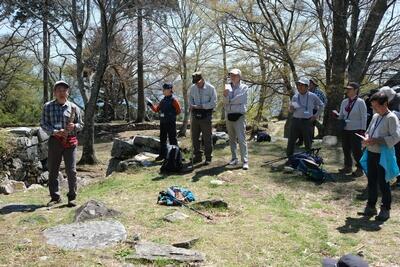 この山頂には、日本三大山城の一つで最大規模を誇る高取城址があり、建物は残ってないものの石垣は圧巻。桜のシーズンは残念ながら終わってしまっていましたが、新緑の美しい景色が広がっていました。また、恒例の山頂での歌は「荒城の月」で、歌詞にピッタリでした。