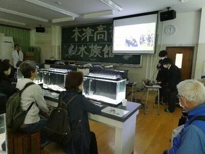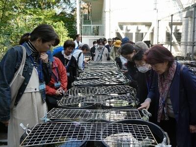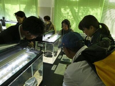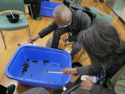 木津高校ねんりんサロン・山城再発見コース連携事業「高校生が案内する!木津高水族館」を開催しました。木津高校3年生(科学部と自然探究コースの生徒)が主体となって、木津高水族館の展示の説明や学習の取組を紹介され、シニア大学から22名が参加しました。様々な種類のメダカの育成や圧巻の水槽に展示された生物の餌やりを間近で見ながらザリガニ釣りも体験させていただくなど、高校生と交流しながら木津川流域の様々な生物に触れることができ、あっという間の1時間でした。