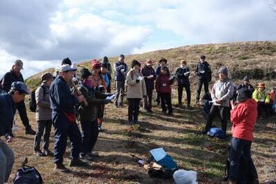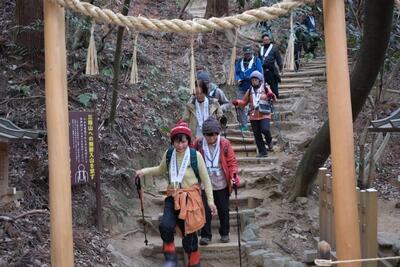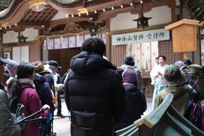 真冬の冷たい空気と飲食や私語、写真撮影などが禁止されている神の領域入り、緊張感と神々しさを感じながらひたすら無言で歩き続けました。山頂付近には磐座が鎮座し、それぞれお祈りをして登った道を全員無事に下りてきました。参加者からは、「登りが続き思ったよりきつかった」、「神聖な空気を感じた」、「御神体の山に登拝でき清々しい気持ちになれた」などの声が聞かれました。
